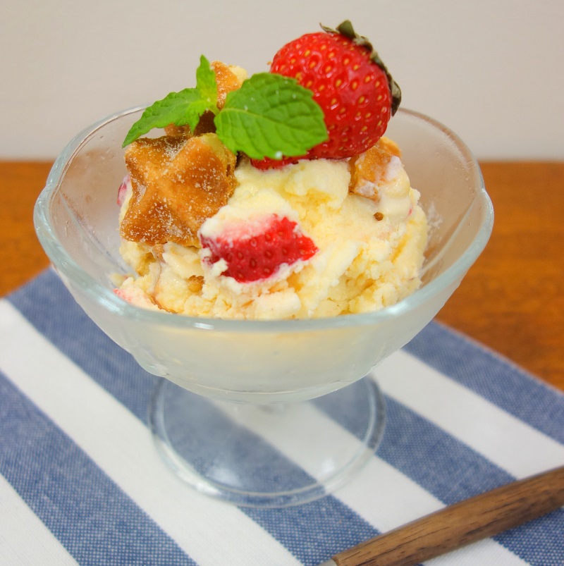 3. バニラアイスに(1)のコロコロワッフルと(2)でカットしたいちごを入れ、スプーンで混ぜ合わせる。