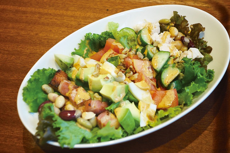 ベーコン、チキン、ゆで卵、アボカドなどをきれいに並べ少しスパイシーなドレッシングをかけた、満足感のあるサラダ。