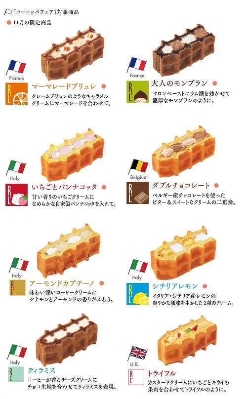 11月は「ヨーロッパフェア」として、フランスのモンブラン、イタリアのパンナコッタ、ベルギーのチョコレートなど 各国の代表的なスイーツや食材をワッフルにアレンジ。