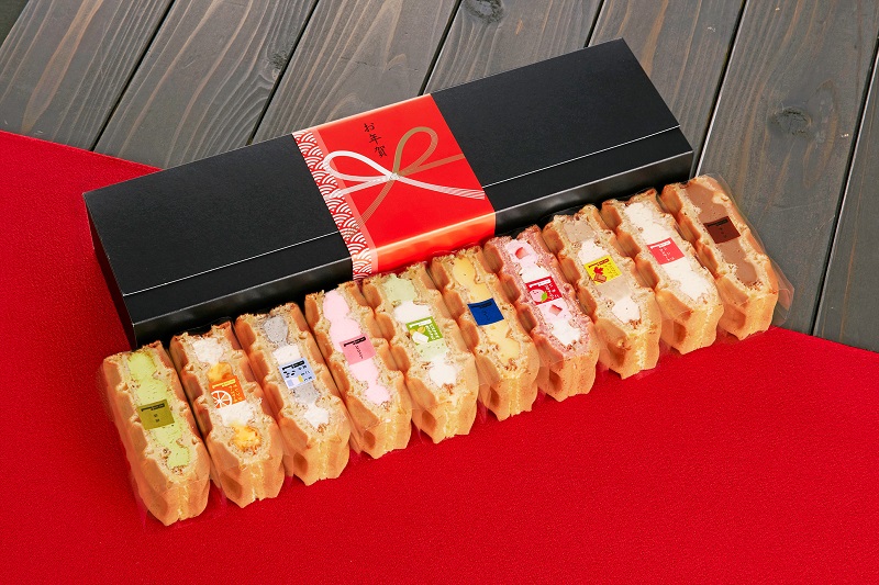 スティック状に焼き上げたクッキータイプのワッフルにチョコをかけた、スティックワッフル2種(スイートチョコ・ストロベリーチョコ)をセットにしました。