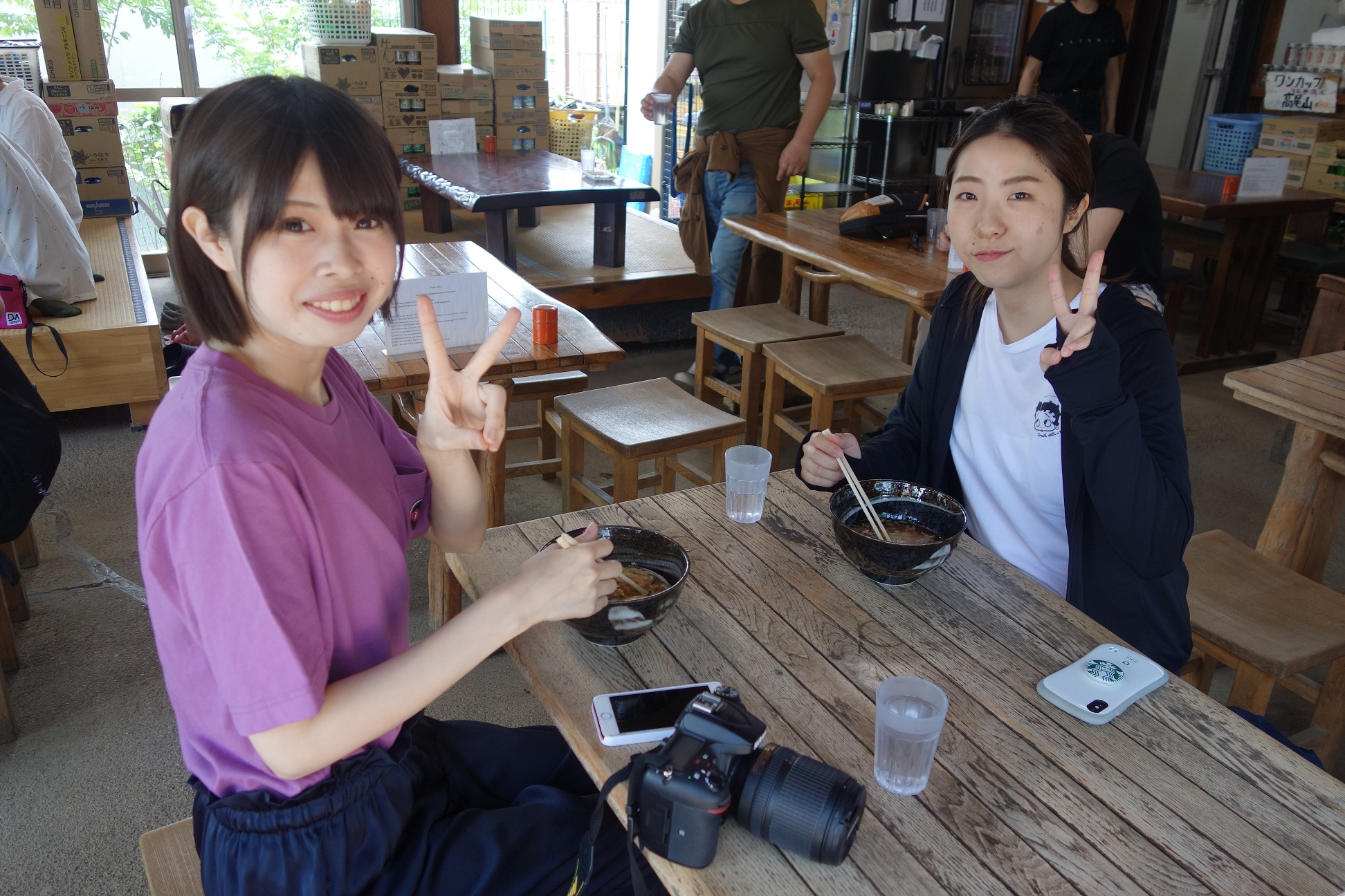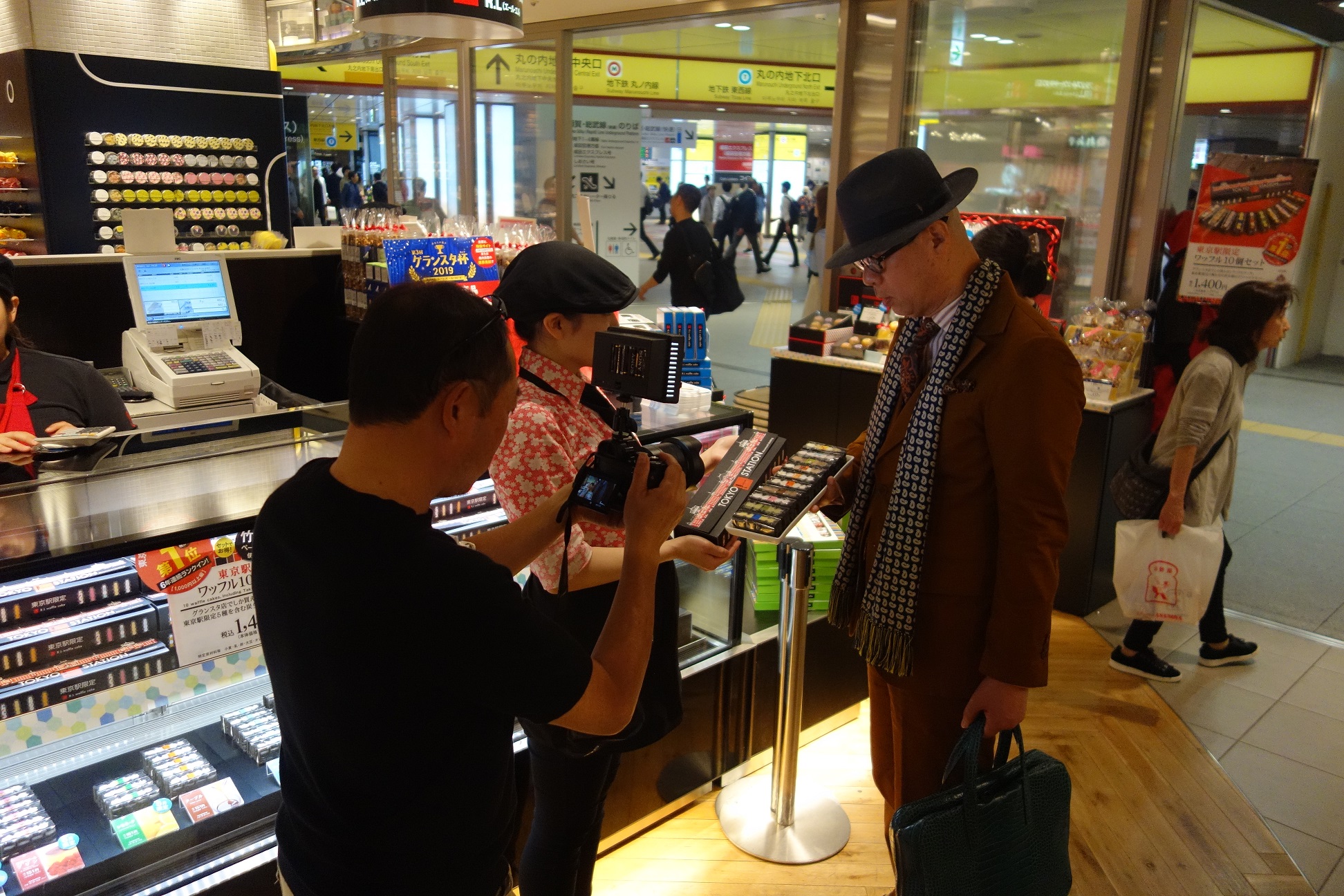 東京駅・グランスタ店での店頭撮影では店舗スタッフさんと一緒に。
