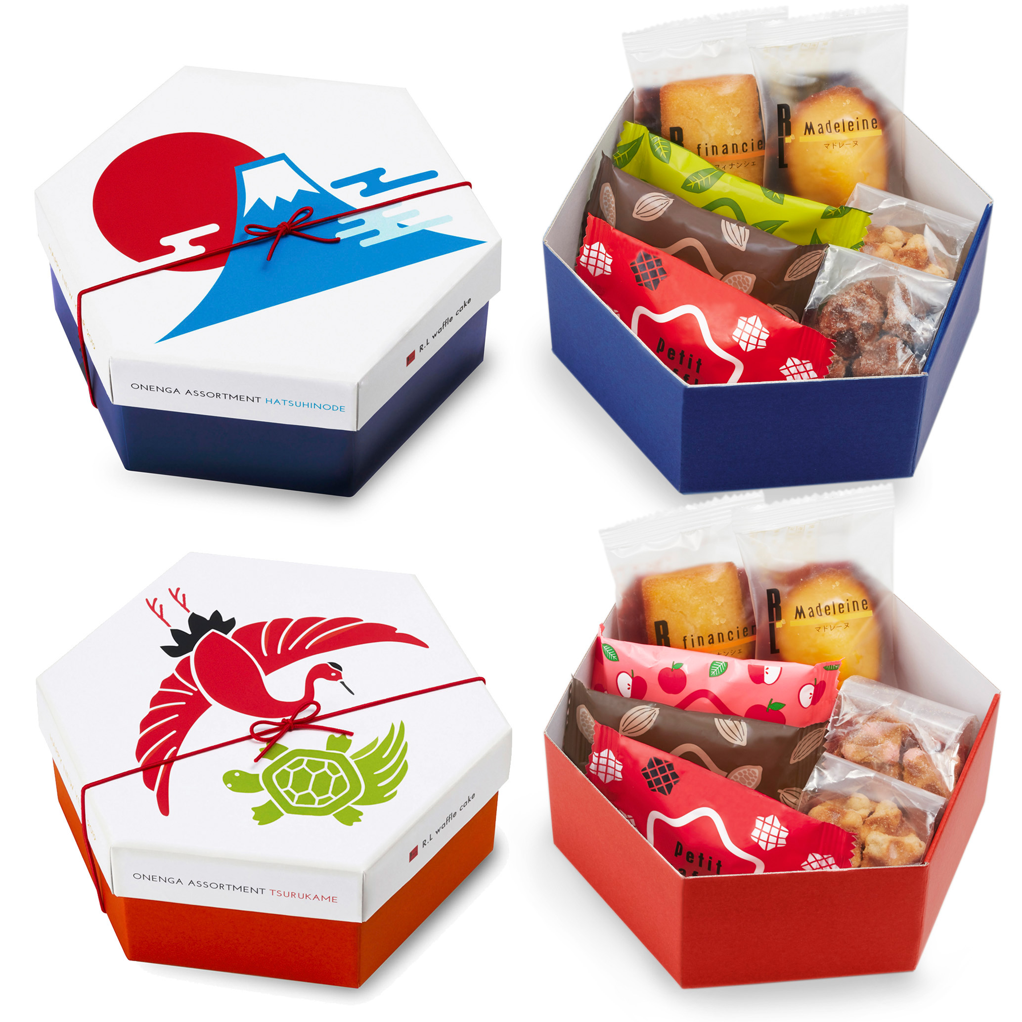 六角形のパッケージに鶴亀と初日の出の新年らしい