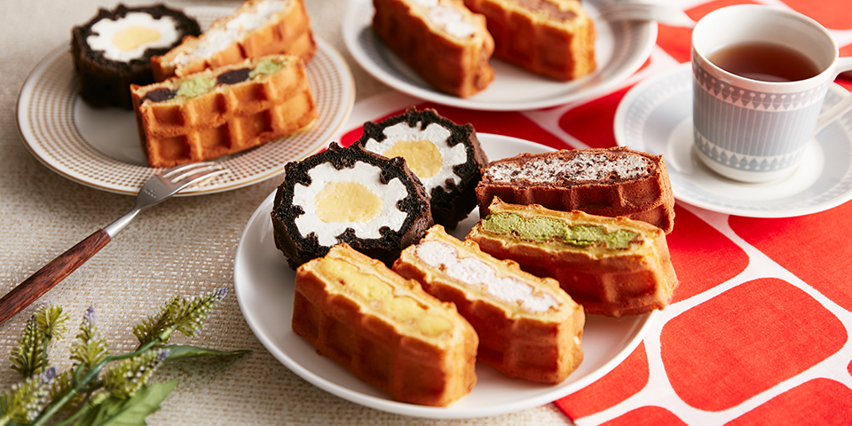どちらもふわふわのワッフル生地でクリームを包み込んだ一品ですが、包み方によって変化する食感や美味しさの違いを、ぜひ食べ比べてお楽しみください!